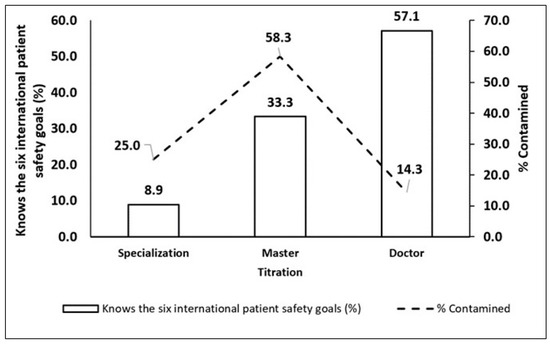 The Chi-square test was used to assess whether the surgeon with the highest level of qualification had a greater understanding of international patient safety standards and whether they were more meticulous in the surgical asepsis procedure. The results showed a significant association (Chi-2 = 17.2, p < 0.05) of dependence and the surgeon’s degree when evaluating knowledge of the six international goals for patient safety. The higher the degree, the greater the knowledge of the six goals. A significant association was also observed between the presence and absence of contaminants after asepsis (Chi-2 = 6.69, p = 0.035) in relation to the surgeons’ titles. Surgeons with doctoral qualifications had fewer contaminants after hand asepsis (14.3% of contaminants) compared to with a master’s degree (58.3%). However, those who had only specialization had 25% less contaminants (Figure 2).