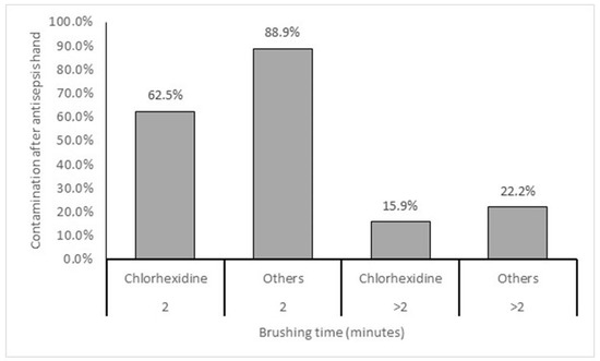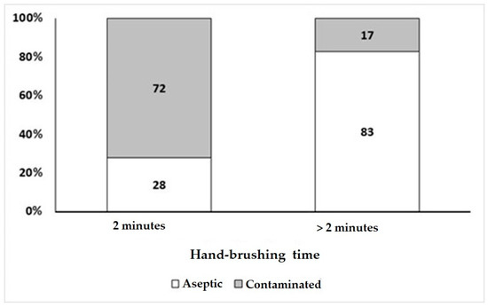 Concerning the different times used by the surgeons to perform hand antisepsis, we found that the majority, 76.3%, spent 3 to 5 min, six of them spent more than 5 min, while that 19.1% performed the wash in 2 min (Table 5). It is important to note that the researcher responsible for collecting the samples did not interfere or give any instructions about the procedure. Thus, data obtained during surgical antisepsis accurately reflect the amount of time usually spent by each research participant. Our intention was to evaluate the surgeons’ typical behaviors to accurately determine their effectiveness in preventing contamination. Regarding physicians who spent 2 min on asepsis, the multivariate statistical analysis showed that brushing time equal to 2 min increases the risk of contamination by 12 times when compared with more than 2 min. Furthermore, we observed that the use of 2% chlorhexidine reduced hand contamination after antisepsis, but brushing time longer than 2 min had a more expressive effect in reducing hand contamination of surgeons after antisepsis (Figure 4). Although there are some contradictions regarding the use of artifacts, such as a brush or sponge, in hand antisepsis, as well as the antiseptic product [82,83,84], most of them follow the traditional technique that uses 2% chlorhexidine [82], as it has longer-lasting effects [84]. As for brushing time, the average brushing time is 2 min [85], although ANVISA recommends 3 to 5 min. This work agrees with ANVISA because when the brushing time is longer than 2 min, it significantly reduces the colony-forming unit (CFU) [83,85,86,87]. On the other hand, one of the disadvantages of using a brush is the probability of causing injuries to the surgeon’s skin, increasing the risk of contamination or discomfort, which is why it is suggested not to use this artifact or to the reduction in brushing time or just rubbing the hands with the antisepsis product [82].