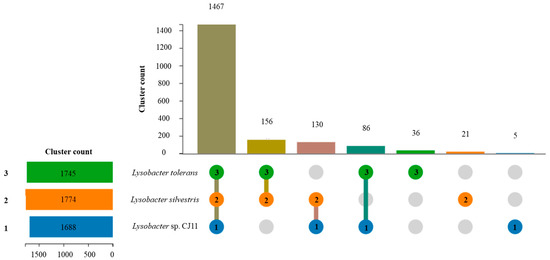 Using OrthoVenn3 showed the proteome comparison among the selected three Lysobacter species: (1) strain CJ11T (blue); (2) L. tolerans UM1T (green); (3) L. silvestris AM20-91T (orange). There were 1467 orthologous gene clusters shared by three strains. When strain CJ11T was compared with phylogenetically close Lysobacter species, 130 and 86 clusters were shared between strains 2 and 3, respectively. Strains 1, 2, and 3 had five, 21, and 36 unique clusters, respectively.
