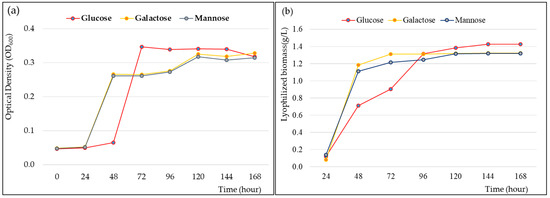 Cell growth rate (a) and exopolysaccharide (EPS) production (b) of Lysobacter soyae CJ11T over time. Glucose, galactose, and mannose were used, respectively, as carbon sources.
