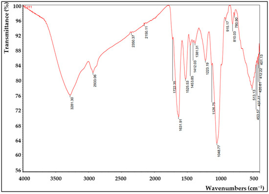 FTIR analysis was applied to confirm the presence of functional groups in EPS (Figure 7). A hydroxyl expansion vibration of the polysaccharide band was observed at 3281 cm−1 of the FTIR peak of the CJ11T EPS [79], thus suggesting that this polymer is EPS. The peak observed around 2933 cm−1 in the spectrum corresponding to the methyl group was due to the C–H stretching vibration [80]. A 1631 cm−1 peak was found predicting the presence of a C=O group, which showed similar results in our previous study [81]. A peak corresponding to the N–H vibration of the amine group (peptide or proteins) was observed at 1540 cm−1 [82]. The peaks appearing around 1412 cm−1 and 1223 cm−1 were presumed to be COO− vibrations and O–S–O groups, which are evidence of sulfuric acid esters, respectively [83]. The signal representing the stretching vibration of C–O and the changing angle vibration of O–H appeared around 1048 cm−1 [84]. The absorption band at 1048 cm−1, which is in the range of 1000–1200 cm−1, corresponded to the presence of carbohydrates [85]. The peak near 915 cm−1 was suggested to be pyranose [86]. FTIR analysis with other species of the same Lysobacter genus showed a similar profile [13].