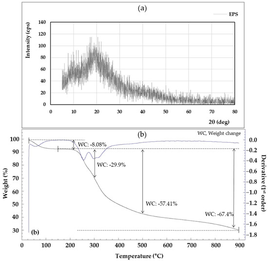 As shown in Figure 8a, the XRD of the EPS was amorphous and showed a broad peak approximately from 5° to 20° (2θ). The XRD result is an indication that the EPS is in an amorphous state, and the EPS pattern shows a similar result to the EPS produced by Lysobacter sp. MMG2 [13]. The XRD pattern is a frequently used tool for confirming the crystallization and properties of materials, and crystallization analysis is important because it greatly reflects the thermal properties of materials and affects their temperature [87].