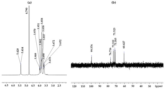 The structure of the EPS produced by L. soyae CJ11T was established on the basis of one-dimensional NMR spectra (13C and 1H). The 1H-NMR spectrum of the EPS from L. soyae CJ11T is shown in Figure 9a, displaying 14 resonances at δ 5.42, 5.41, 4.79, 3.99, 3.97, 3.95, 3.88, 3.59, 3.84, 3.82, 3.69, 3.67, 3.63, and 3.65 ppm. In the 1H-NMR result of the EPS produced by L. soyae CJ11T, one anomeric signal was detected at δ 4.79 ppm [90]. 1H-NMR is usually used to determine the glycosidic bond structure of polysaccharides. The EPS showed a signal lower than δ 4.8 ppm; therefore, it is a proton signal for β-anomer pyranose. FTIR analysis showed a band for pyranose; hence, the two results were the same [91]. The 13C-NMR spectrum of the EPS produced by L. soyae CJ11T showed the signal of one anomeric region (δH 95–110 ppm) at δH 95.576 ppm [92]. Ring carbons were found at δH 50–85 ppm, alkyl carbons were found at δH 15–25 ppm, and carbonyl carbons were found at δH 165–180 ppm [92]. As shown in Figure 9b, on the basis of the chemical shift of the 13C-NMR, one signal was detected in the anomeric region, indicating the presence of that obtained from the 1H-NMR results.