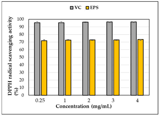 DPPH free-radical-scavenging activity of exopolysaccharides (EPS) produced by strain CJ11T. Error bars represent the standard deviation of the mean (n = 3).