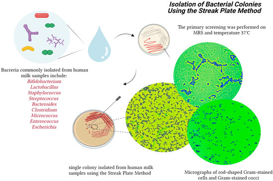 Isolation of the bacterial colonies from breast milk. Created with “Biorender.com (accessed on 5 June 2023)”.