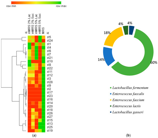 Figure 4a presents a hierarchical clustering of the selected 28 strains using optical density (OD) values after growth on different nutrient media. The OD600 provides information on the development of microorganisms after 24 h of cultivation. Almost all strains grew the fastest and had the highest optical density values after cultivating MRS with 2% glucose. Most of the selected 28 strains grew better on a lactose-containing medium than on sucrose. Perhaps it is no coincidence that there are strains in breast milk that absorb lactose well.