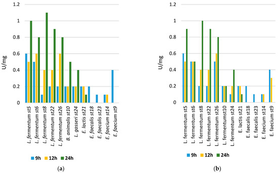 We monitored the dynamics of the β-galactosidase activity values in 12 studied strains. In Figure 5, the values of the cell-bound β-galactosidase activity are presented. The enzyme activity values after cell lysis were significantly lower. The Lactobacillus strains showed higher activities compared to the Enterococcus strains. The most increased activity was reported in the strain Lactobacillus fermentum st 8 on 8% lactose. This is proof that, as potential probiotics, the representatives of the genus Lactobacillus, through their β-galactosidase activity, actively participate in the breakdown of lactose and thus support absorption by the newborn.