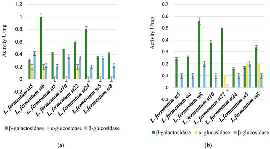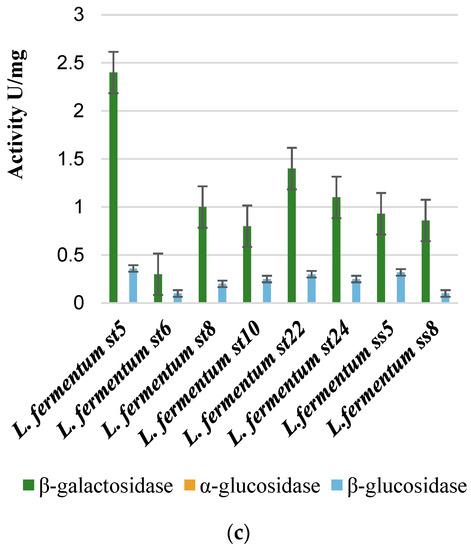 We followed the β-galactosidase, α-glucosidase activity, and β-glucosidase activity of the selected only Lactobacillus strains. The primary trend that can be reported is that there was a strain-dependent possibility in the assimilation of the studied sugars, as shown in Figure 6.