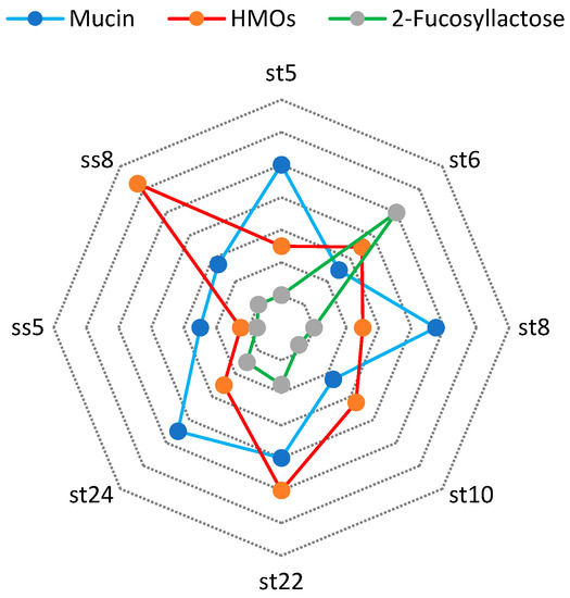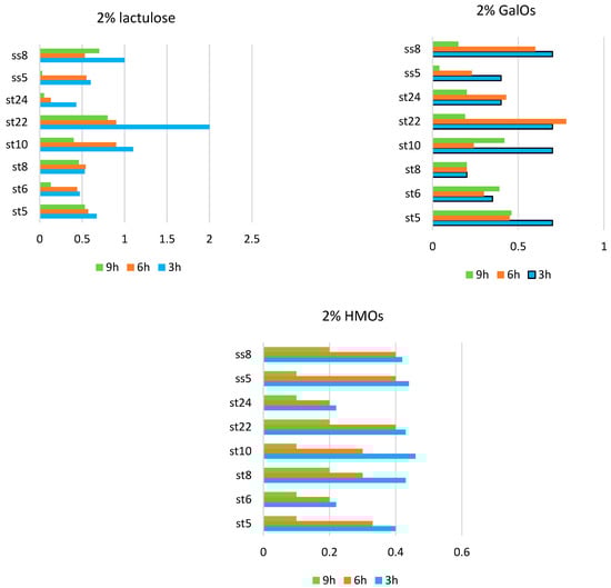 3.2.2. Metabolism of Galactooligosaccharides (GalOs), Lactulose, and Human Milk Oligosaccharides (HMOs) by the Studied Strains