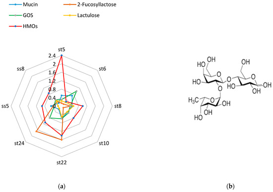 Beta-galactosidase activity after cultivation on mucin, 2-fucosyllactose, GOS, lactulose, and HMOs (a) and the structure of 2-FL (b).