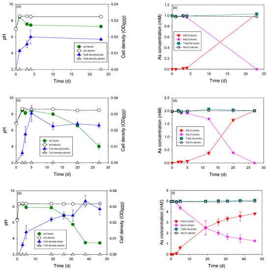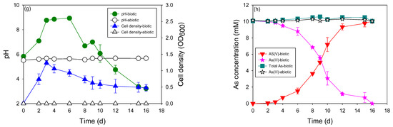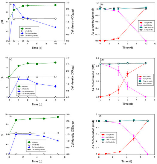 - Nguyen, V.K.; Tran, H.T.; Park, Y.; Yu, J.; Lee, T. Microbial arsenite oxidation with oxygen, nitrate, or an electrode as the sole electron acceptor. J. Ind. Microbiol. Biotechnol. 2017, 44, 857–868. [Google Scholar] [CrossRef]