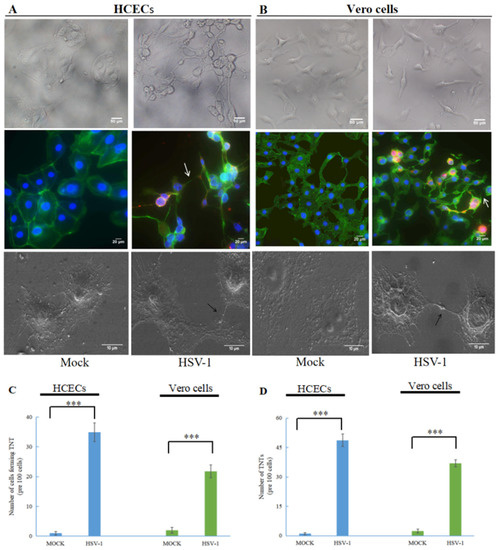 HSV-1 induces the formation of tunneling nanotubes (TNTs) in human cornea epithelial cells (HCECs) and Vero cells. HCECs (A) and Vero cells (B) at 24 h.p.i. with wild-type HSV-1 (multiplicity of infection (MOI) of 1) were photographed with an optical microscope, (200×); HCECs at 24 h.p.i. with wild-type HSV-1 (MOI of 1) were paraformaldehyde-fixed, permeabilized and stained for F-actin (FITC-Phalloidin, green staining), and HSV-1 proteins were detected using anti-HSV-1 gD antibody (red staining). White arrows indicate TNTs (400×); HCECs at 24 h.p.i. with wild-type HSV-1 (MOI of 1) were fixed with glutaraldehyde and observed using scanning electron microscopy, and black arrows indicate TNTs (2000×); graphs showing the number of TNTs (C) and the number of cells forming TNT (D) between infected cells (means ± SD) of triplicate assays (***, p < 0.001).