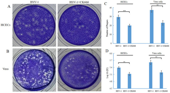 HCECs and Vero cells were infected with HSV-1 at an MOI of 1, and treated with or without 50 uM CK666. Then, the cell lysates of HCECs and Vero cells were collected and the confluent Vero cells infected. After adsorption in 5% CO2 at 37 °C for 1 h, the medium was removed and the cells washed with PBS three times, then medium added with 1.5% methylcellulose (Sigma, Cream Ridge, NJ, USA). At 72 h.p.i., cells were fixed with methanol-acetic acid (2:1) for 1 h, then stained with crystal violet and visualized using microscopy. The number of plaques was measured. Data shown represent the mean ± SD of triplicate assays.
