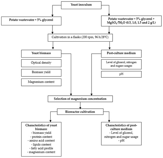The conducted research showed the possibility of using potato wastewater and waste glycerol from the production of biodiesel as cheap components of the culture medium for producing the cell biomass of C. jadinii ATCC 9950 yeast. By supplementing the culture media with Mg2+ cations, valorisation of the cell biomass of the tested yeast strain was achieved, which can be successfully used as a potential source of well-absorbed magnesium bioplexes to treat a deficiency of this element in the diet of animals and humans. The cell biomass of C. jadinii yeast obtained with a 3.5 L-scale bioreactor with a medium of potato wastewater and glycerol enriched with the addition of magnesium at a dose of 2 g Mg2+/L was characterised by a high content of magnesium, a valuable profile of fatty acids (oleic, linolenic) and a high content of proteins with a favourable amino acid composition due to the significant proportion of some exogenous amino acids (especially lysine, valine, leucine and isoleucine).
