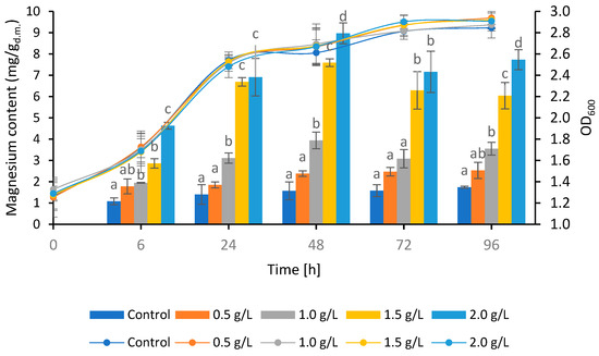The amount of magnesium bound by yeast during cultivation in the control (0 g Mg2+/L) and experimental media (0.5, 1, 1.5 and 2 g Mg2+/L) (column chart) and changes in optical density during cultivation (line graph) a–d—indicate non-significant differences between groups, determined using Tukey’s test, p < 0.05.