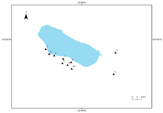 Distribution map of Tamarix chinensis Lour rhizosphere samples in the Ebinur Lake Wetland. The Arabic numbers 1–10 indicate the distribution locations of all sampling sites.
