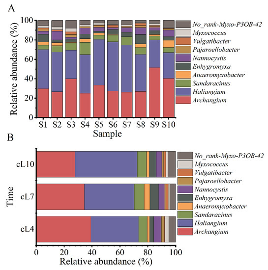 The sequence number of myxobacteria identified in the rhizosphere soil of Tamarix chinensis Lour fluctuated in the range of 91~1493 tags, accounting for 0.29–2.78% of the sequence number of all bacteria in the soil samples collected from various sampling points. Except for undefined No_Rank Myxo P3OB-42, 1 order, 3 suborders, 8 families, and 11 genera were identified from each sample. The three suborders were Cystobacterineae, Sorangiineae, and Nannocystineae. The eight families were Myxococcaceae, Sandaracinaceae, Haliangiaceae, Nannocystaceae, Anaeromyxobacteraceae, Polyangiaceae, Vulgatibacteraceae, and Phaselicystidaceae. The 11 genera were Archangium, Haliangium, Anaeromyxobacter, Enhygromyxa, Nannocystis, Pajaroellobacter, Myxococcus, Vulgatibacter, Phaselicystis, Chondromyces, and Sandaracinus. The spatial variations in the myxobacterial community at the genus level are shown in Figure 2A. The relative abundance of Archangium in all samples ranged from 11.72% to 36.63%, with the highest relative abundance in the sample collected from the S9 site and the lowest in the sample from the S4 site. The relative abundance of Haliangium ranged from 14.65% to 30.40%, with the highest and lowest relative abundances observed in the S10 and S6 samples, respectively. The relative abundance of Sandaracinus ranged from 2.56% to 5.86% (highest in the S4 sample and lowest in the S1 and S5 samples). The relative abundance of Anaeromyxobacter ranged from 0% to 4.03%, with the highest relative abundance in the S10 sample. The relative abundance of Enhygromyxa ranged from 1.10% to 4.76% (highest in the S8 sample and lowest in the S5 samples). The relative abundance of Nannocystis ranged from 1.10% to 4.40% (highest in the S2 sample and lowest in the S3 and S6 samples). Similarly, relative abundances of Pajaroelobacter, Vulgatibacter, and Myxococcus ranged from 0% to 1.83%, 0% to 1.83%, and 0.37% to 2.20%, respectively. The relative abundances of Pajaroelobacter, Vulgatibacter, and Myxococcus were high in the S3 sample.