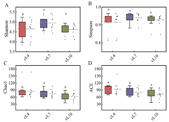 Temporal and spatial distribution of the α diversity of the myxobacteria community. (A) The Shannon index distribution of myxobacteria communities in April, July, and October; (B) the Simpson index distribution of the myxobacteria community in April, July, and October; (C) the Chao1 index distribution of the myxobacteria community in April, July, and October; (D) the ACE index distribution of the myxobacteria community in April, July, and October. The lowercase letters (a,b) above the box represent significant differences (p < 0.05) in the α diversity index of myxobacteria between months.