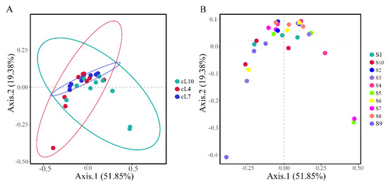 Based on Bray–Curtis distances, principal component analysis was conducted on the genus level myxobacterial community (Figure 5). The results showed that there were significant differences in the temporal distribution of myxobacteria communities in the rhizosphere of Tamarix chinensis Lour. (PERMANOVA: F = 2.453, p = 0.024; Table S1). There was no significant difference between the spatial structure of the myxobacterial communities (PERMANOVA: F = 1.14, p = 0.318; Table S2). Among all the samples, S7, S5, and S9 showed significant differences in the structure of the myxobacterial community, compared to other samples. The differences in the community structure of myxobacteria in other samples were relatively small. The community structure of myxobacteria was mainly influenced by seasonal changes.