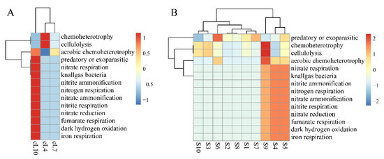 Spatial and temporal heat map of the FAPORTAX function of the Tamarix chinensis Lour rhizosphere in Ebinur Lake wetland. (A) The FAPORTAX functional distribution of myxobacteria in three months; (B) the functional distribution of myxobacteria in habitats S1–S10.
