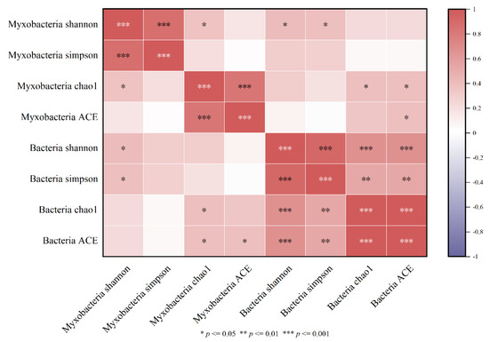 Heatmap of the myxobacterium diversity index and bacterial diversity correlation.
