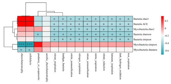 The correlations between the functional abundance of myxobacteria and diversity index of bacteria and myxobacteria are shown in Figure 8. Except for the aerobic chemoheterotrophy, the functional abundance of myxobacteria showed a significant correlation with the diversity index of myxobacteria and bacteria. Chemoheterotrophy and cellulolysis functions were found to be negatively correlated with the Simpson index (p < 0.001) and Shannon index of myxobacteria (p < 0.05). Functions related to nitrogen cycle, such as nitrite respiration, nitrite ammonification, nitrogen respiration, and other functional abundances, were found to be significantly and negatively correlated with the bacterial diversity indices (i.e., Shannon, Simpson, Chao1, ACE). These observations indicated that bacterial diversity was the main factor affecting the nitrogen cycle function of myxobacteria.
