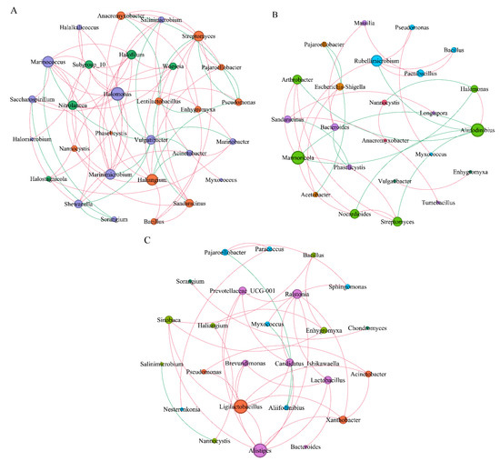 Interaction between myxobacteria and bacterial network in the rhizosphere of Tamarix chinensis Lour in Ebinur Lake wetland. (A) The symbiosis analysis of the myxobacteria genus and bacterial genus network in April; (B) the symbiosis analysis of the myxobacteria genus and bacterial genus network in July; (C) the symbiosis analysis of the Myxobacteria genus and bacterial genus network in October, with node size representing relative abundance, node coloring according to the modularity class process, edges representing the interaction between relative abundance, red lines indicating positive correlation, and green lines indicating negative correlation. The thickness of the edge represents the magnitude of the significant correlation coefficient between the relative abundance of two species.