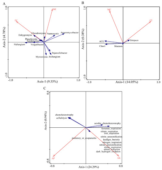 The redundancy analysis of soil physicochemical factors and diversity of myxobacteria in the rhizosphere of Tamarix chinensis Lour in the Ebinur Lake Wetland are shown in Figure 10. Canoco5.0 was used to screen the soil physicochemical factors that significantly affect the structure, diversity index, and function of the myxobacterial community in the rhizospheres. Redundancy analysis was conducted using the screened soil physicochemical factors (Tables S3–S5). The results showed that soil physicochemical factors can affect the structure, diversity, and function of the myxobacterial community in the wetland. The two axes explained 14.33%, 14.43%, and 25.23% of the total variations in the structure, diversity, and function of soil bacterial communities, respectively. EC (p = 0.008, contribution = 54.5%) and MI (p = 0.052, contribution = 45.5%) explained 7.8% and 6.8% of the variations in the community structure of myxobacteria in the rhizosphere of Tamarix chinensis Lour, respectively. EC and MI significantly affected the distribution of myxobacteria, such as Enhygromyxa, Pajaroelobacter, Archangium, and Myxococcus, in the community. This indicated that EC was the main abiotic factor affecting the community structure of myxobacteria and regulating the distribution of myxobacteria in the rhizosphere of Tamarix chinensis Lour. CI (p = 0.066, contribution = 61.2%) and MC (p = 0.168, contribution = 38.2%) explained the 8.8% and 5.6% variations in the diversity of myxobacterial communities in Tamarix rhizospheres, respectively. This indicated that CI was the main abiotic factor affecting the diversity of myxobacteria in the rhizospheres of Tamarix. Similarly, AK (p = 0.046; contribution = 31.6%) and AP (p = 0.036; contribution = 24.3%) explained 14.3% and 11% variations in the functional diversity of myxobacterial communities, respectively. This suggested that AK was the main abiotic factor affecting the functional diversity of myxobacteria in the rhizosphere of Tamarix chinensis Lour. These functions included nitrite_respiration, nitrate_ammonification, nitrogen_respiration, nitrite_ammonification, and nitrate_respiration. Abundance of function such as recruitment was significantly positively correlated with AK (p < 0.05), indicating that AK was able to promote the functional abundance of myxobacteria related to nitrogen cycle and to regulate the expression of functional genes in myxobacteria.