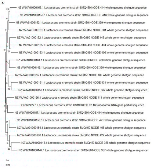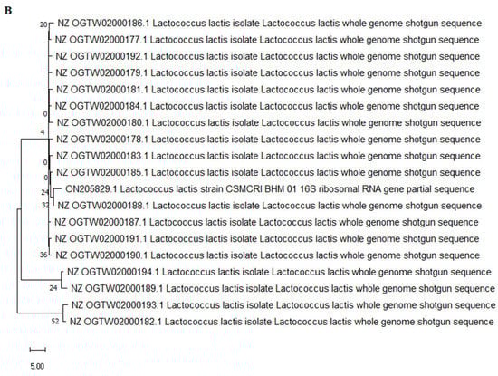 Phylogenetic tree of potential isolate (A) LAB-1 (Lactococcus cremoris) and (B) LAB-2 (Lactococcus lactis).