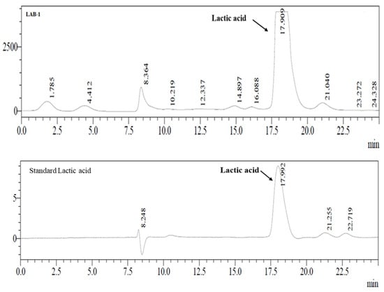 The fermentation broth was centrifuged at 10,000 rpm for 10 min at room temperature, and using 0.2 µm syringe filters the supernatant was filtered for LA estimation by HPLC (Figure 4). The main end-product of LAB isolates is to produce LA by utilizing nutrient components. In these experiments, results showed that LAB-1 (Figure 4) and other strains produce LA in fermentation broth (refer to Supplementary Materials).