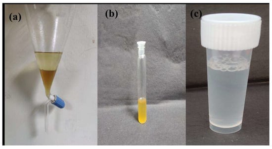 Purification of LA from fermentation broth: (a) phase partitioning method, (b) LA and (c) pure LA (after treatment).