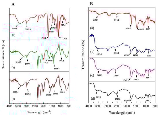 FTIR spectra (A) of (a) standard LA, (b) synthesized LA, and (c) fermentation broth, and (B) of (a) standard PLA, (b) PLA-YSZ, (c) PLA-Sb2O3, and (d) PLA-chitosan.