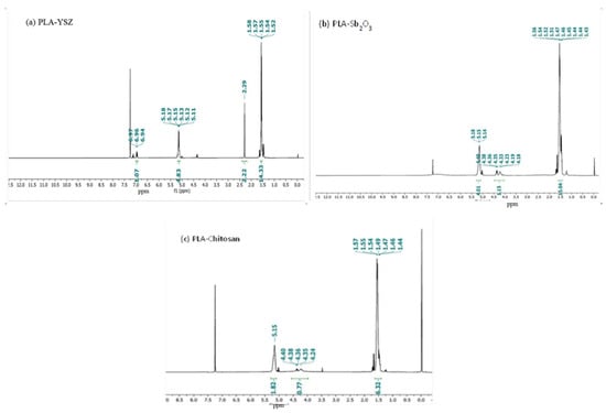 1H NMR of resultant polymer, i.e., (a) PLA-YSZ, (b) PLA-Sb2O3, and (c) PLA-chitosan.