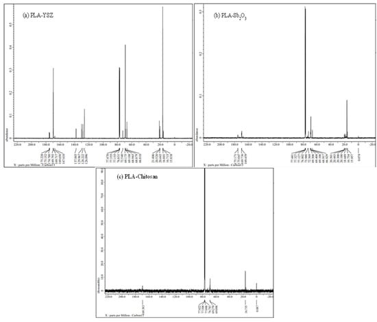 13C NMR of resultant polymer, i.e., (a) PLA-YSZ, (b) PLA-Sb2O3, and (c) PLA-chitosan.
