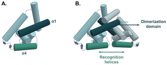 Schematic representation of MarR-like regulator’s structural features. (A). MarR-like monomer subunit with secondary structure elements. (B). MarR-like dimer organization. The two long intersecting helices α1 (dark blue arrow) form the dimerization domain of the two MarR-like monomers, and the two recognition helices α4 (green arrow) form the wHTH DNA-binding domain. The α2, α3, α5 and α6 helices are shown in light blue. Based on PDB ID: 3QPT.