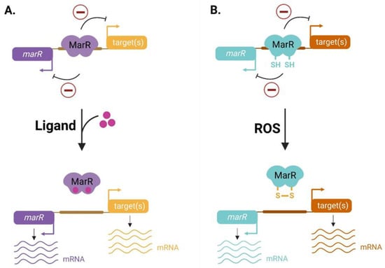 - Will, W.R.; Fang, F.C. The Evolution of MarR Family Transcription Factors as Counter-Silencers in Regulatory Networks. Curr. Opin. Microbiol. 2020, 55, 1–8. [Google Scholar] [CrossRef]