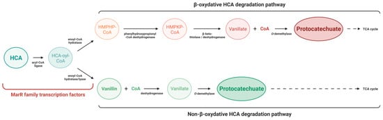 Degradation of HCA by β-oxidative and non-β-oxidative pathways. The first two steps of HCA degradation pathways are regulated by MarR-like regulators (red) in Rhodopseudomonas palustris and Agrobacterium fabrum C58 in the β-oxidative pathway and in Acinetobacter sp. ADP1, Pseudomonas fluorescens BF13 and Sphingobium sp. SYK-6 in the non-β-oxidative pathway. p-coumarate and ferulate are degraded by these pathways. The protocatechuate released at the end of the pathway is then incorporated into the TCA cycle via the β-ketoadipate pathway. HCA: Hydroxycinnamates; CoA: Coenzyme A; HMPHP: 4-hydroxy-3-methoxyphenyl-β-hydroxypropionic acid; HMPKP: 4-hydroxy-3-methoxyphenyl-β-ketopropionic acid [55].