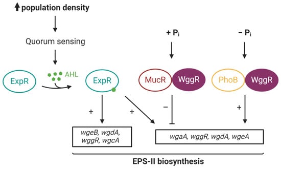 Regulation network model for EPS-II biosynthesis in Sinorhizobium meliloti. Under phosphate-starvation conditions, WggR (purple) and PhoB (orange) cooperatively induce EPS-II biosynthesis. At higher phosphate concentrations, only MucR (red) and WggR repress the expression of EPS-II biosynthesis genes. When the population density increases, AHL (green) produced by bacteria are recognized by the ExpR receptor regulator (light blue). ExpR can then induce the expression of EPS-II biosynthesis genes and counteract the repression exerted by MucR (in the presence of WggR). AHL: Acyl Homoserine Lactone; Pi: Inorganic phosphate. wgeB, wgdA, wggR, wgcA, wgaA and wgeA genes belong to the exp cluster [78].