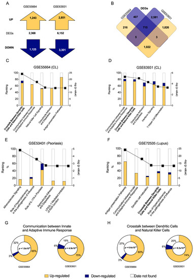 Differentially Expressed Genes (DEGs) in CL patient skin lesions obtained from two publicly available datasets and canonical pathways associated to disease. (A) Total number of DEGs, including up-regulated (yellow) and down-regulated (blue) genes, contained in the GSE55664 and GSE63931 datasets. (B) Venn diagram showing DEG overlap between the two datasets. Graphs illustrate the numbers of up-regulated (yellow) and down-regulated (blue) molecules, as well as the number of missing molecules (white) in data sets for CL GSE55664 (C) and GSE63931 (D). Additionally, up- and down-regulated molecules were evaluated for Psoriasis (E) and Lupus (F) to be able to compare the canonical pathways with CL. Of the five most significant canonical pathways related to immune response in both transcriptomes, the two most important pathways identified by Ingenuity Pathway Analysis were Communication between Innate and Adaptive Immune Response (G) and Crosstalk between Dendritic Cells and Natural Killer Cells (H).