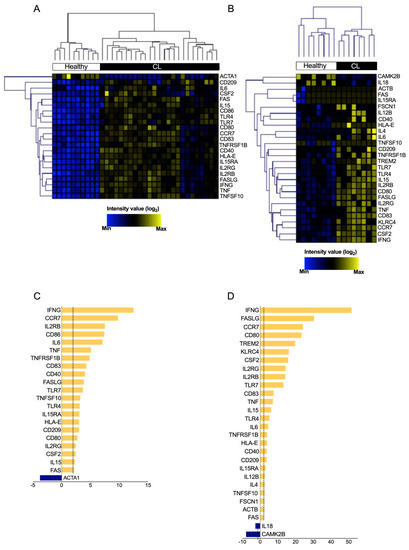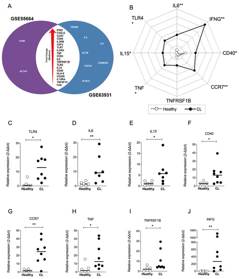 Each dataset (GSE55664 and GSE63931) was analyzed by Ingenuity Pathway Analysis (IPA) (www.qiagenbioinformatics.com (accessed on 15 March 2022) to identify pathways related to CL. The search term “Immune response” was applied to identify specific pathways of interest, considering only DEGs in each dataset.
