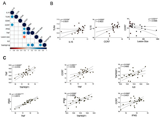 Considering that gene expression could be associated with the lesion stage (Figure 4), a correlation matrix was constructed with the validated genes (Figure 3) and the lesion size. Only statistically significant correlations are shown in the matrix (Figure 4A), revealing a positive association between IL15 and TLR4, as well as CCR7 (Figure 4B). The lesion size negatively correlates with CCR7, and we also found a positive correlation of TNF/TNFRSF1B with CCR7, IL6 and IFNG (Figure 4C), suggesting that TNF/TNFRSF1B signaling orchestrate the inflammation mediated by CCR7, IL6 and IFNG, nourishing an inflammatory loop that can lead to ulceration and a chronic lesion.