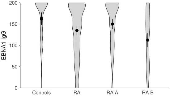Rheumatoid arthritis is an autoimmune disease characterized by chronic inflammation and destruction of joints. The worldwide prevalence of RA is around 1%, two to four times more common in women than men leading to reduced life expectancy and overall quality of life [1]. Synovial hyperplasia, joint destruction and the production of autoantibodies such as rheumatoid factors (RFs) and anti-citrullinated protein antibodies (ACPAs) are hallmarks of the disease [2]. The etiology of RA still needs to be wholly resolved. It is a multifactorial disease involving complex interactions between genetic and environmental factors [3]. Motifs QKRAA, QRRAA and RRRAA at positions 70–74 of the third hypervariable region within human leukocyte antigen DRB1 (HLA-DRB1) alleles are called “shared epitopes” and represent the most important genetic factors for the susceptibility and severity to RA [4]. Epstein–Barr virus (EBV) is a ubiquitous environmental factor linked to RA. Over 90% of the human population is infected with EBV by the age of forty [5], and EBV establishes lifelong latency in memory B lymphocytes after primary infection. EBV can exhibit three latency states (I, II, III) with expression of a limited number of genes, including Epstein–Barr nuclear antigen (EBNA1) [5]. EBV can switch from latent to lytic phase and reactivate in both immunocompetent and immunocompromised individuals. Different viral proteins are produced during reactivation, including early antigen (EA) [6], a DNA polymerase accessory protein that initiates viral replication and the lytic phase of EBV infection in B cells [2]. Different serological profiles could be related to latent and lytic stages of EBV infection. Anti-EBV-CA (capsid antigen—CA) and anti-EA antibodies of IgM and IgG classes are produced during the primary infection. In contrast, anti-EBNA1 antibodies are detected during recovery and the late primary infection disease [7]. Anti-EBNA1 and anti-EBV-CA IgG antibodies imply past EBV infection, while anti-EA antibodies indicate viral replication [7].