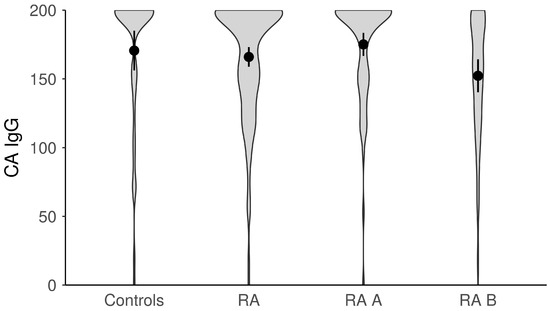 The titers of anti-EBV-CA IgG antibodies in study groups (dots represent means and whiskers 95% of the mean). CA—capsid antigen; RA—all rheumatoid arthritis patients; RA A subgroup—newly diagnosed RA patients; RA B subgroup—methotrexate-treated RA patients.
