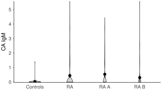 The titers of anti-EBV-CA IgM antibodies in study groups (dots represent means and whiskers 95% of the mean). CA—capsid antigen; RA—all rheumatoid arthritis patients; RA A subgroup—newly diagnosed RA patients; RA B subgroup—methotrexate-treated RA patients.