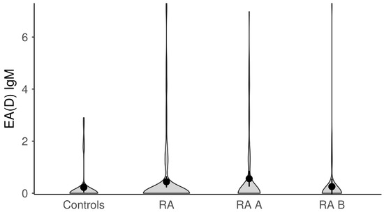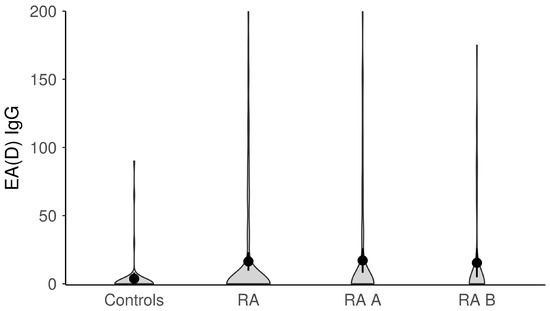 The titers of anti-EBV-EA(D) IgM antibodies in study groups (dots represent means and whiskers 95% of the mean). EA(D)—early antigen (diffuse); RA—all rheumatoid arthritis patients; RA A subgroup—newly diagnosed RA patients; RA B subgroup—methotrexate-treated RA patients.