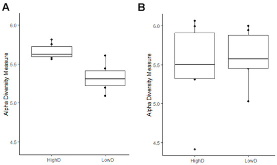 Boxplots representing the α-diversity index of Shannon from (A) larvae and (B) soil microbiomes from high- (HD) and low- density (LD) sites.