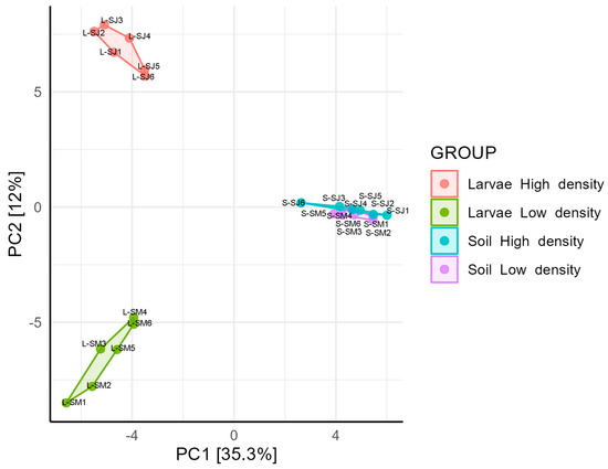 Principal components analysis (PCA) showing taxa structural composition of soil and larvae microbiomes sampled in high- and low-density sites. Data were log-transformed, and distances measured by Bray-Curtis distances.