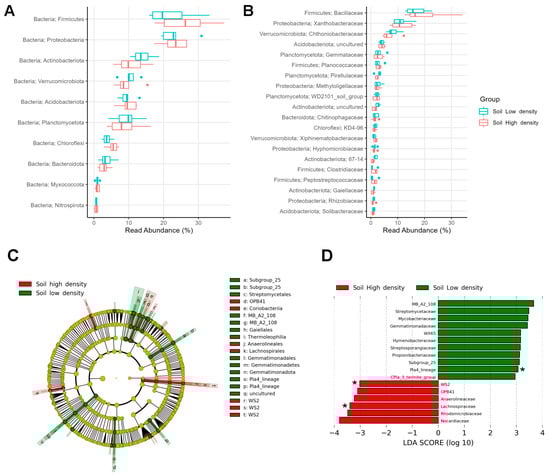 Relative abundance of top taxa found in the soil microbiomes of high- and low-density sites: (A) Top 10 phyla and (B) top 20 families. Biomarkers in soil microbiomes: (C) Dendrogram and (D) bar plot showing discriminative bacterial phyla and families between infestation sites. Asterisks (*) depict exclusive families.