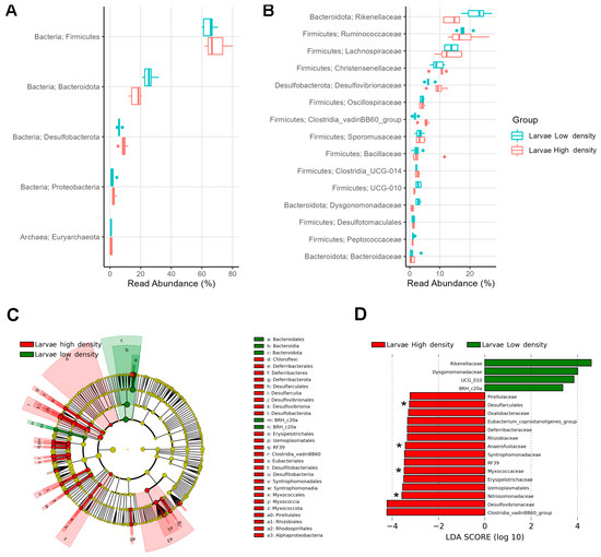 Relative abundance of top taxa found in the larval gut microbiome: (A) Relative abundance of top 5 phyla and (B) top 15 families found in larval group samples from high- and low-density sites. Biomarkers in the gut microbiomes of larvae: (C) Dendrogram and (D) bar plot showing discriminative phyla and families between infestation sites. Asterisks (*) depict exclusive families.