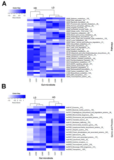 Heatmaps showing differences in metagenomic (A) KEGG pathway (level 3) and (B) gene/protein families between the gut microbiomes of larvae from high- and low-density sites, analyzed by LEfSe (LDA > 2.0, p < 0.05). Samples nomenclatures are defined in Supplementary Table S1.